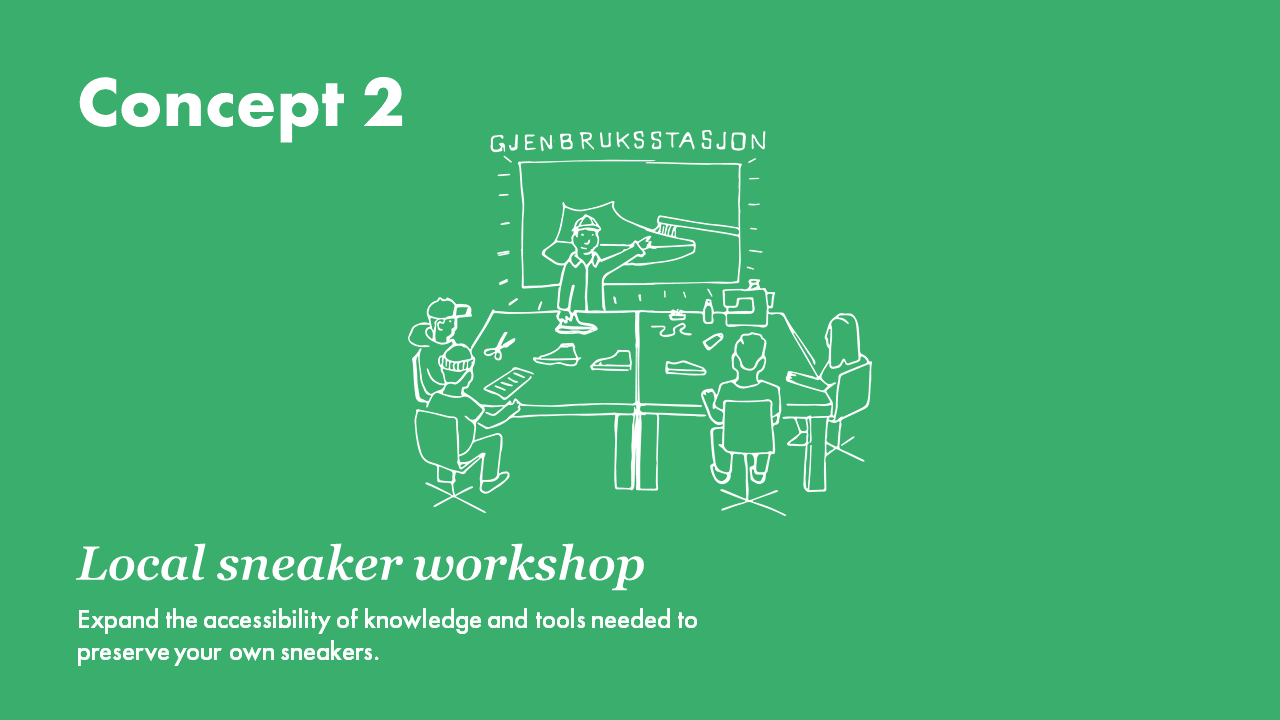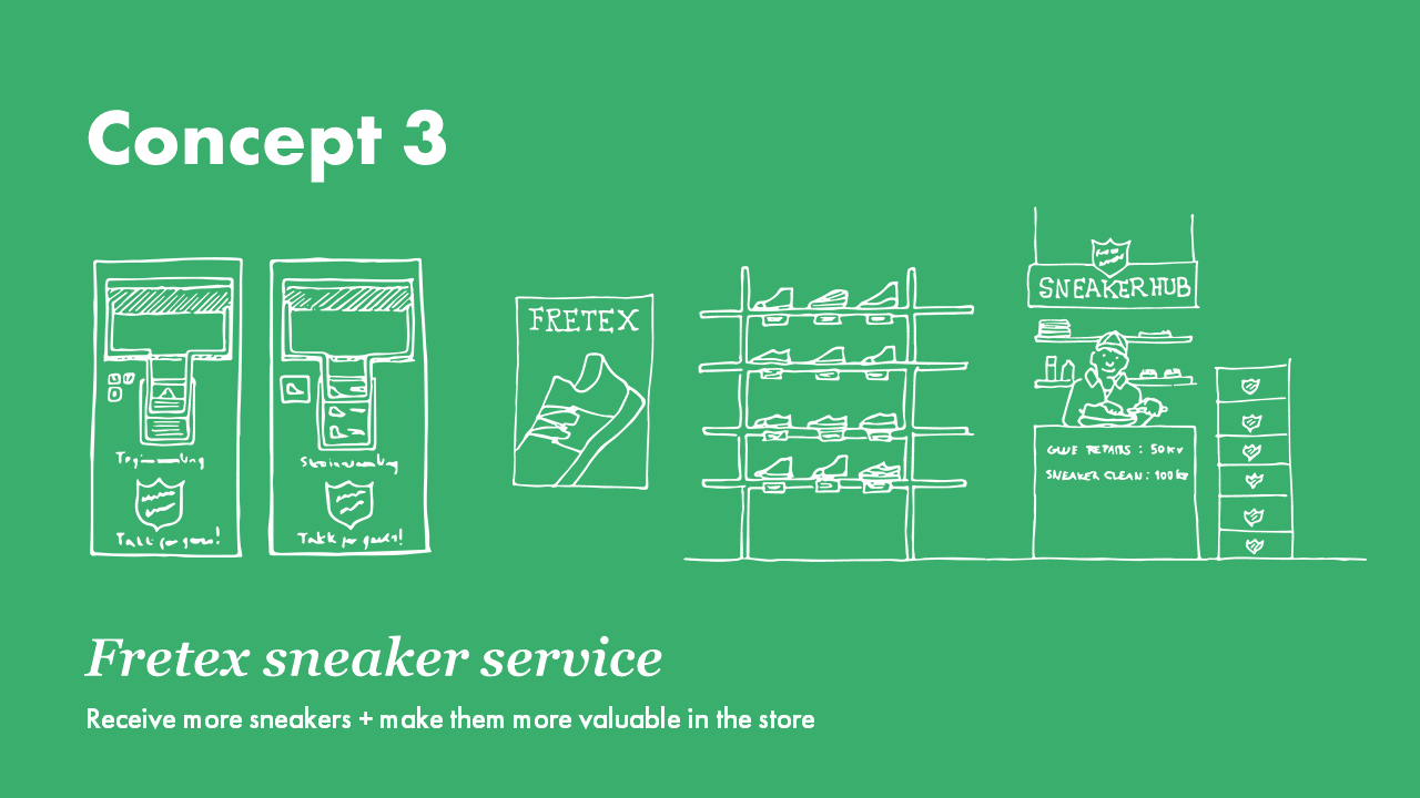 The three concepts I chose from my ideation process were: a sneaker fixing advertisement to make it more visible to potential customers that cobblers can repair sneakers; a sneaker repair workshop supported by the municipality to make it cheaper and more accessible to repair your own shoes; and finally a series of touchpoints to help Fretex sell more used sneakers. This final concept included implementing separate shoe collecting boxes and a dedicated Fretex shoe shop which I wanted to test by hosting a sneaker pop-up in a Fretex store.